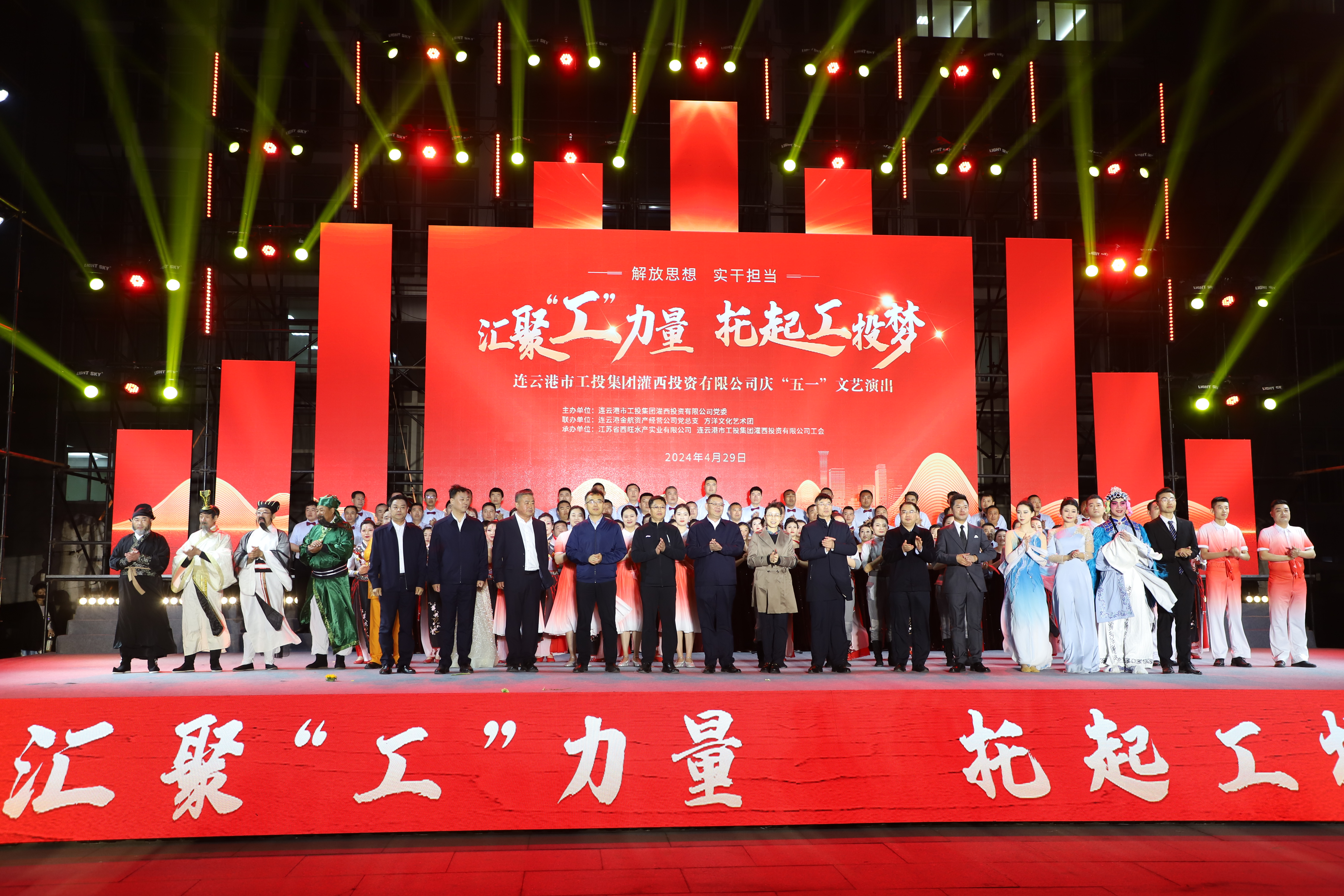 429日晚,灌西投資公司《匯聚“工”力量,托起工投夢(mèng)》慶“五一”文藝演出在機關(guān)大樓前廣場(chǎng)舉行。本次活動(dòng)由灌西投資公司黨委主辦,連云港金航資產(chǎn)經(jīng)營(yíng)公司黨總支、方洋文化藝術(shù)團聯(lián)辦,旨在通過(guò)藝術(shù)的形式,營(yíng)造崇尚勞模、學(xué)習先進(jìn)、尊重勞動(dòng)的良好氛圍,豐富公司員工的文化生活,激發(fā)干事創(chuàng )業(yè)熱情。集團公司領(lǐng)導張六林、戴鴻鳴、汪群及部分部門(mén)負責人,灌西、金航資產(chǎn)經(jīng)營(yíng)公司領(lǐng)導班子成員出席演出活動(dòng),縣臨港產(chǎn)業(yè)區管委會(huì )、華能灌云清潔能源發(fā)電責任有限公司、徐圩新區方洋集團等有關(guān)領(lǐng)導受邀觀(guān)看演出。