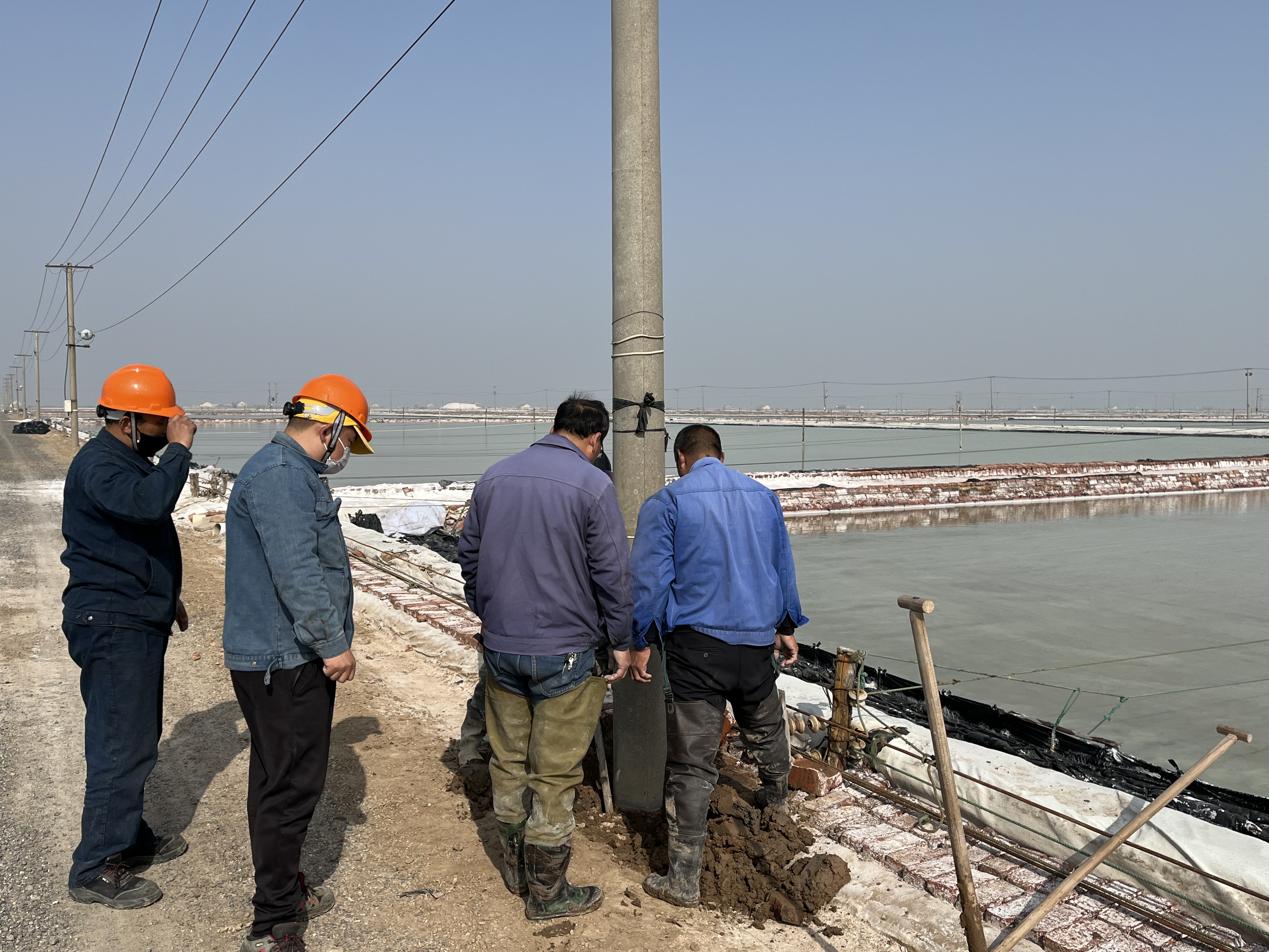 經(jīng)過(guò)多年的風(fēng)吹雨打,新河制鹽公司四班大池道邊上的電線(xiàn)杠出現大面積傾斜現象,嚴重影響安全生產(chǎn)。9日上午,公司安全負責人趙斯忠,組織部分后勤及班組人員一起為整改工作出點(diǎn)子,解決本次隱患整改的難點(diǎn)。
