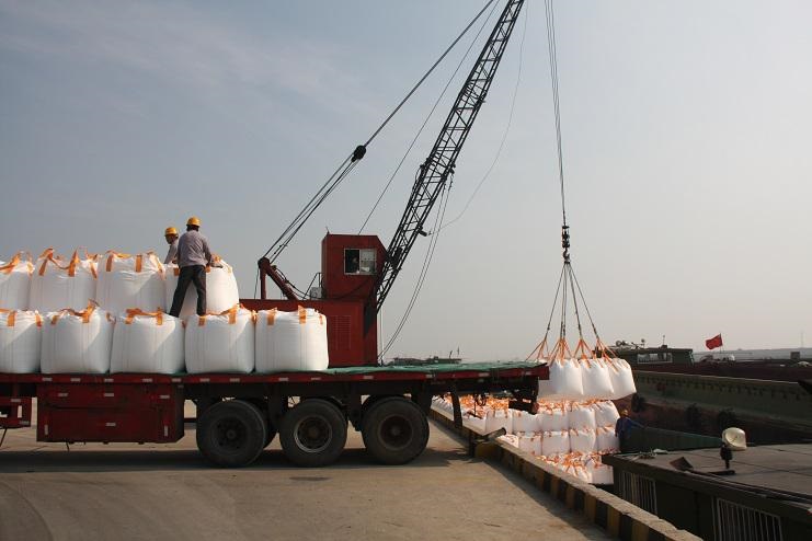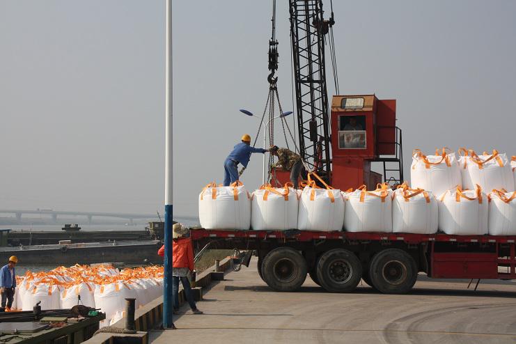 4月30日上午9時(shí)許,隨著(zhù)一聲汽車(chē)長(cháng)笛,一輛載有近40噸化工物資的卡車(chē)徐徐??吭谙笪锪鞴疚骞嗪哟a頭邊,緊接著(zhù)碼頭鐵臂起舞,機械操作工嫻熟地操縱著(zhù)塔吊機械,準確地將一包包噸貸物資裝卸在碼頭邊的貨船中。。。。。。自此,一輛輛滿(mǎn)載40余噸貨物的卡車(chē)源源不斷向碼頭駛來(lái)。