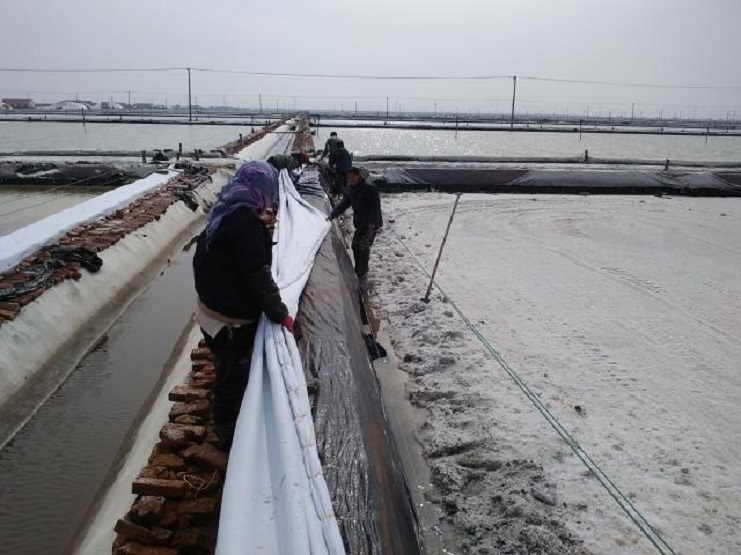 新河制鹽分公司為了盡快改善食用鹽基地面貌,減少池埝上固化紅磚風(fēng)化,沙塵落入鹽池內,對池鹽的污染,近期組織分公司職工,對基地塑池的紅磚固化池埝進(jìn)行處理,先用黑塑布把池埝重包一遍,然后再用土工布苫好。有效地減少了雜物落入池鹽中,為產(chǎn)合格食用鹽提供了良好生產(chǎn)環(huán)境。(圖為職工們正在苫蓋紅磚固化池埝。)