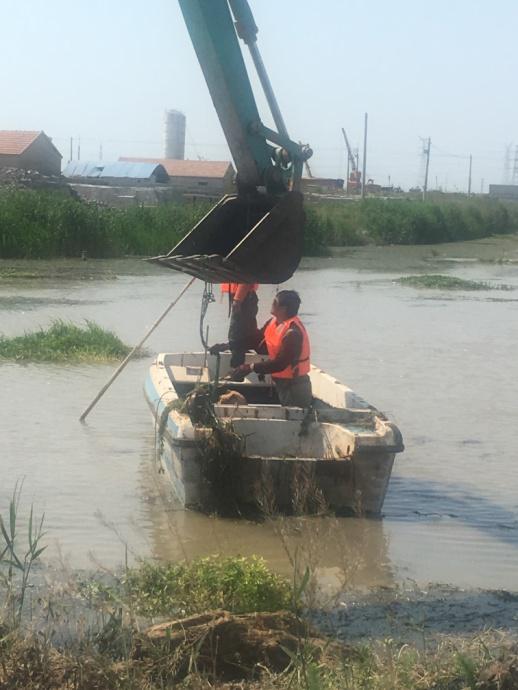 近日,機電服務(wù)公司租用長(cháng)臂挖掘機清理西旺公司泵站河道的水草。又因河道中間水草面積較大,挖掘機不能完全清理,機電服務(wù)公司機電組王緒華等人,租用小船用繩子加鐵鉤等辦法,清理河道中的水草。(蘇南)