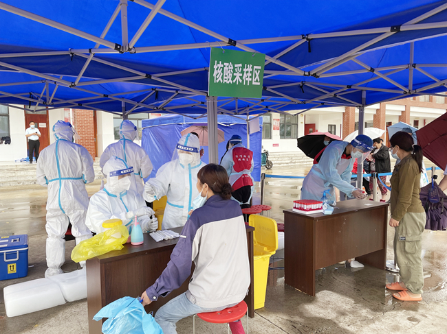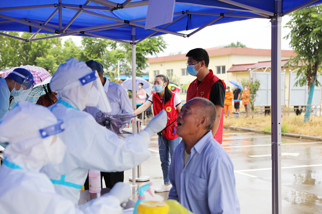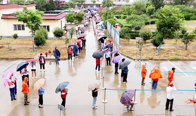 “黨旗飄在一線(xiàn)、堡壘筑在一線(xiàn)、黨員沖在一線(xiàn)”。核酸檢測現場(chǎng),來(lái)自青口公司黨員志愿者在現場(chǎng)為職工群眾提供相關(guān)咨詢(xún)和掃碼指導服務(wù),很多黨員在核檢工作中全身濕透仍在雨中盡力維護秩序,盡管天氣不作美,但是職工群眾依然按工作人員的指導有序地進(jìn)行核酸檢測。大雨里,黨員紅、醫護白顯得格外耀眼。(仲偉彬)
