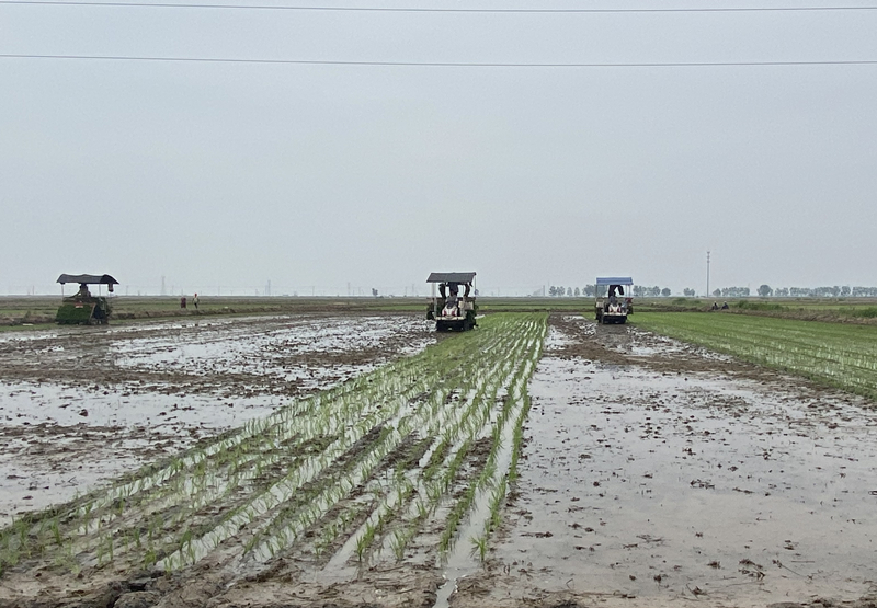 走進(jìn)大新農場(chǎng)田間地頭,伴隨著(zhù)機械轟鳴聲,插秧機往來(lái)穿梭,一株株嫩綠的秧苗在插秧機苗盤(pán)上滑落,整齊地插入水田里。
