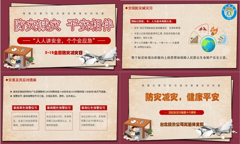 近日,離退休支部開(kāi)展“5·12防災減災”科普活動(dòng)。結合支部的實(shí)際情況,通過(guò)辦公場(chǎng)所用電防火安全檢查和交通出行安全警示,進(jìn)一步排查整改生活、工作中存在的安全隱患。組織觀(guān)看防災減災宣傳片和制作防災減災PPT來(lái)普及防災減災知識,了解地震、臺風(fēng)、暴雨、洪水等自然災害的應對措施,來(lái)防范化解災害風(fēng)險,提升公眾防災減災的意識和能力,實(shí)現“人人講安全,個(gè)個(gè)會(huì )應急”。