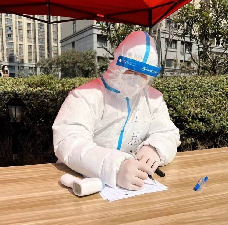3月12日,社區統一安排,換了崗位,經(jīng)過(guò)崗前細致培訓后,負責信息登記、測試體溫、發(fā)放檢測卡,服裝也由一次性塑料服換上了“大白服”。服裝升級了,說(shuō)明防護級別也升級了,他二話(huà)沒(méi)說(shuō),服從安排,迅速到崗?!澳?,請在這邊登記信息,測量一下體溫”,這是他每天重復最多的話(huà),他穿著(zhù)密閉的防護服,連上一趟衛生間都成了一件很奢侈的事情,為了節約醫療物資,早晨不敢多喝水,工作期間不喝水,直到檢測結束才和其他工作人員一起吃飯。有人問(wèn):“這項工作有風(fēng)險,怕不怕?”他說(shuō):“怕,當然怕,但和身邊的醫護人員比起來(lái),我這點(diǎn)真不算什么,向他們致敬!”目前,他所在小區已經(jīng)進(jìn)行了13次全員核酸檢測,他每次早上7點(diǎn)到崗,下午2點(diǎn)左右結束,脫下防護服后背都是濕漉漉的。