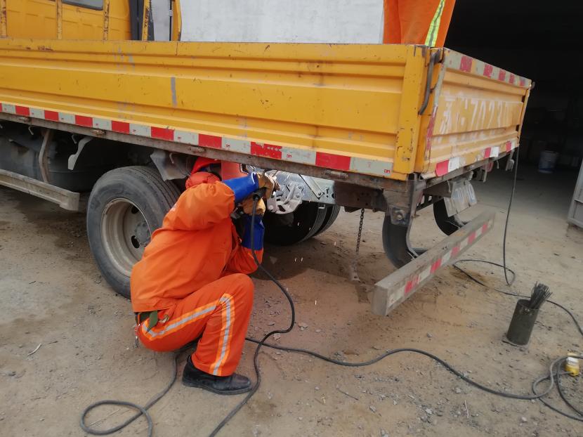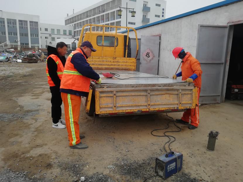 1月9日上午,經(jīng)過(guò)該公司設備維修班組再三斟酌,考慮如送修理廠(chǎng)維修,不但產(chǎn)生一筆不小的維修費用,而且等待維修過(guò)程時(shí)間較長(cháng),影響工作進(jìn)度,為能給公司節省開(kāi)支和不影響工作進(jìn)度,維修人員量好車(chē)廂底板尺寸后,將鐵板切割出需要的尺寸,一塊塊拼湊起來(lái),加固在車(chē)廂底板上,通過(guò)半天的時(shí)間,順利為工具車(chē)底板披上一層合身、漂亮又特別的“盔甲”,有效延續了它的使用壽命。