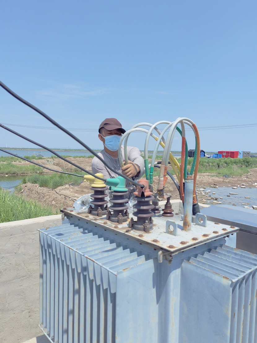 10時(shí)40分搶修工作全面展開(kāi),當天地下氣溫接近38度,塔臺上氣溫接近50度,變壓器上燙的要命,人在上面只是感覺(jué)熱浪滾滾,電工尹永明身上衣服很快被汗水濕透,太陽(yáng)暴曬,如火的驕陽(yáng)絲毫沒(méi)有阻擋施工進(jìn)度,一切工作都進(jìn)行的繁忙有序,井井有條。中午12時(shí)30分經(jīng)過(guò)近2個(gè)小時(shí)的搶修,工作人員完成了變壓器的維修任務(wù),保證了魚(yú)塘用電設備的正常運轉。