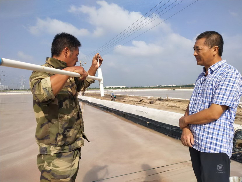 上圖為礦鹽生產(chǎn)顧問(wèn)王緒前在現場(chǎng)指導測量鹵水波美度及相關(guān)數據