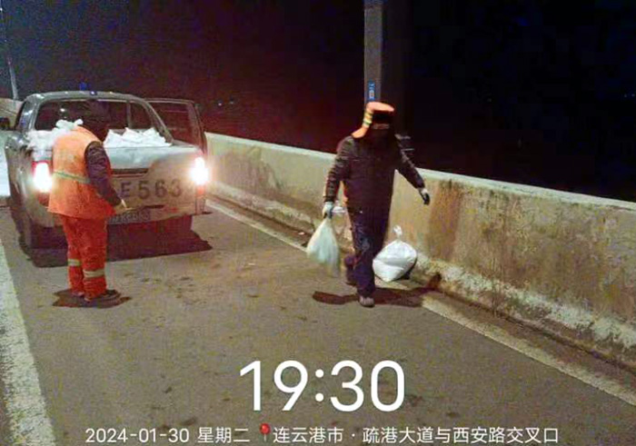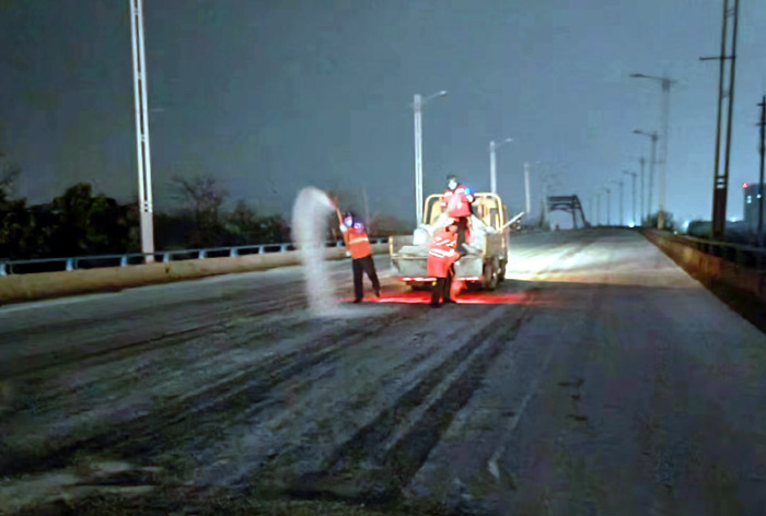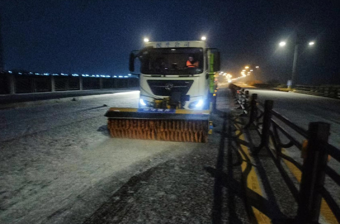 截止早上7點(diǎn),悅升公司共出動(dòng)機械設備10臺、人員260余人,對橋梁和重點(diǎn)結冰地段使用融雪劑150余噸,及時(shí)消除路面冰凍隱患100余處。